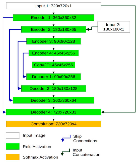 We implement the Unet classification architecture with code from [36] modified to (1) include a fourth encoder/decoder pair and (2) replace the upsampling layers in the decoder blocks with 2D transposed convolutions to perform the upsampling with trainable parameters. The architecture is designed for input images of 224 × 224 × 3 and is shown in Figure 2. Dimensions of 224 × 224 are somewhat arbitrary but convenient. In Sentinel-2 imagery, this equates to an image footprint of 2.24 km, which is larger than most (but not all) rivers [1]. Also, this is the common size used in many datasets, notably ImageNet [37], and makes the models and data produced here suitable for cross-comparisons and further research. Next, we use the TensorFlow [16] implementation of the Segformer B3 variant, pre-trained with the 1.2 million samples in the ImageNet-1K dataset [37], available in the Huggingface transformers Python package [38]. This architecture will be used on images of 720 × 720 × 3. These dimensions were arrived at after experimentation with our GPU and considerations of the scale of the world’s large water bodies. The Amazon river has a maximum width of roughly 3 km (300 pixels in Sentinel-2) [1]. Similarly for lakes, Downing et al. [2] estimate that of the ~300 million lakes on Earth, 15,905 have an area above 10 km2. A tiles size of 720 × 720 @10 m, 51.8 km2, should therefore sample the vast majority of terrestrial lakes. As stated above, our third model will be an image fusion algorithm that will combine the outputs of the classification attention-Unet, and the Segformer ViT is a modified attention-Unet with a dual input. We create a modified encoder block that concatenates the second input class raster at a point in the encoder pathway where the input raster has undergone 2 sets of convolutions and max pooling and therefore has XY dimensions of ¼ of the original input which matches the output of the ViT. Based on the success of the residual learning approach of [39], each encoder layer has a skip connection to the associated decoder layer in order to achieve the maximum retention of small features. The inputs dimensions are designed to be 720 × 720 × 1, obtained after re-assembling the tiles of 224 × 224 × 1 and re-splitting, and the 180 × 180 × 1 arrays directly output by the ViT. We refer to this as our Unet fusion model (Figure 3).