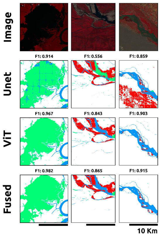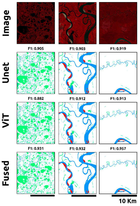 Figure 5 shows 3 examples chosen from the 67 seen testing tiles. The figure shows the image and the outputs from the attention-Unet, the Segformer ViT and the final class fusion model. The F1 scores show a weighted average for the river, lake and bar classes. We note the following key observations: The F1 score for the dual-input fusion model is higher than the intermediary F1 scores for either the attention-Unet or the ViT. The models display a strong ability to map rivers and lakes as distinct classes. Figure 6 shows 3 examples taken from the 100 unseen testing tiles. Here, we deliberately choose cases where significant errors in the attention-Unet outputs are recovered by the ViT. On the left, we see a case with a large lake. In this case, the attention-Unet output ambiguous results with many lake pixels falsely classified as river along the margins of several 224 × 224 tiles. The ViT did not make this error and produced a more consistent prediction. The final dual-input fusion prediction is more accurate than either the ViT or the attention-Unet. In the middle of Figure 6, we see a case where a wide river channel was falsely classified as a lake. Again, the ViT made a better prediction, and the fusion model is the most accurate. On the right of Figure 6, we see a case where a large area of dry land was falsely classified as dry river sediments. Once again, the ViT and final fused prediction did not inherit these errors.