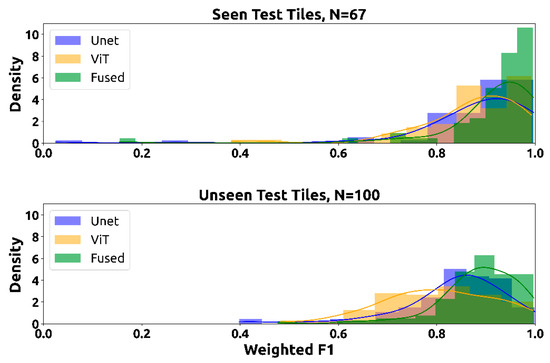 In Figure 7, we show the distribution of F1 scores calculated for individual tiles in the seen and unseen test datasets. We use the Mann–Whitney U test and the Kolmogorov–Smirnov test to test for statistically significant differences in the distributions. For the seen data on the top of Figure 7, the Unet and ViT distributions are not significantly different with p-values of 0.208 and 0.329. The Unet and the Fusion distributions are significantly different with p-values of 0.013 and 0.016. Similarly, the ViT and Fusion distributions are significantly different with p-values < 0.000 in both cases. However, readers should note a tail of poor performance with a small number of samples having an f1 score below 0.6. In the case of the unseen data at the bottom of Figure 7, the Unet and ViT distributions are significantly different with p-values of 0.016 and 0.006. Here, the fusion distribution is very significantly different from both the Unet and ViT distribution with all paired tests returning p-values < 0.000. Again, there are some poorly performing outliers in the distribution. If we compare the fusion distributions for the seen and unseen data, we again find a significant difference with a p-value < 0.000. This confirms the slight degradation of performance in the unseen test data with respect to the seen test data.