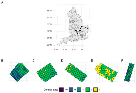 (A) The location of the 31 fields at which both weed density state and hyperspectral image data were collected in England. (B–F) Examples of weed density state distributions in 5 example fields in the dataset, colours represent different density states (Absent, Low, Medium, High, and Very High). Each quadrat represents a 20 m × 20 m area in which weed density was assessed and classified into one of the five density states.