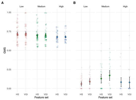 The classifiers displayed good within-field accuracy (i.e., high GMS) for all density states (Figure 3A). All three density states displayed high levels of classification accuracy, with low and medium states being, on average, easier to predict than high states. On average, classifiers using the VGI feature set tended to have higher classification accuracy, although these differences were not statistically significant. When the ensembles of classifiers were used to predict observations from new fields, however, classification accuracy was poor (Figure 3B). Unweighted classifiers ( = 0) displayed much lower classification accuracy scores than the within-field cross-validation exercise, with all classes’ geometric mean score values decreasing from around 0.7 to 0.1 for low and high states. Medium state classification accuracy had slightly higher out-of-field accuracy scores (0.2) than high and low states, but still a large decrease from the within-field accuracy. Again, there were no clear differences in classification accuracy between the HS and VGI feature sets. The poor out-of-field performance is also evident using additional performance metrics (Figure S1).