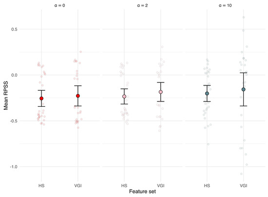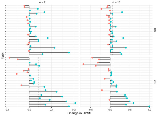 The change in RPSS for each field within our dataset for each value of . Blue points over zero indicate an increase in field-scale predictive performance, red points below zero indicate a decrease in performance. Dashed vertical lines represent the average change in RPSS across all fields in each feature set and weighting. HS represents the hyperspectral feature set and VGI the vegetation index feature set.