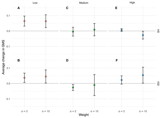 The average change in classification accuracy (change in geometric mean score-GMS) for hyperspectral (HS) and vegetation index (VGI) feature sets. Classification accuracy is presented for low (A,B), medium (C,D), and high (E,F) density states for different levels of . is the parameter controlling the size of the weights given to classifiers relative to the distance of the spectral signature of the classifier field and new data. Values over zero indicate an increase in accuracy, values below zero represent a decrease in accuracy. Point values are the change in average accuracy score for predictions made to each quadrat within a field. Vertical bars are 95% confidence intervals.