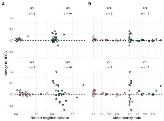 The change in RPSS versus the nearest neighbour distance (A) and mean density state of each field (B) for each value of alpha for both hyperspectral (HS) and vegetation index (VGI) feature sets. The nearest neighbour distance represents the median hypothesis margin distance to the nearest neighbour of a field, i.e., the field with the closest spectral similarity.
