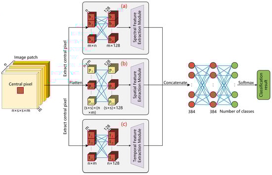 The architecture of the TDMSANet is presented in Figure 1. The TDMSANet is essentially an image patch-based deep learning model, which takes time-series image patches as model inputs. Each image patch has a shape of , where represents the length of image time series, represents the width of image patch, and represents the number of spectral bands. During the classification process, the input image patch was fed into three different channels, respectively, and the outputted features from each channel were concatenated together for final crop classification (Figure 1). The detailed structure of the three modules (channels) is elaborated as follows.