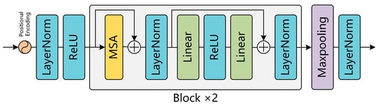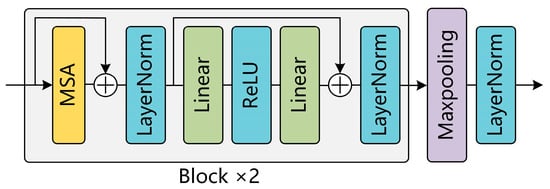The transformed feature sequence was employed as the input of Spectral Feature Extraction Module, the structure of which is shown in Figure 2. As demonstrated by the figure, the module consists of two identical blocks. In each block, a Multi-head Self-Attention (MSA) layer was first adopted in the module. Specifically, a residual connection between the input and output of the MSA layer was employed to prevent the issue of gradient vanishing []. A Layer Normalization (LayerNorm) layer was adopted subsequently to enable the model to converge quickly, followed by two consecutive linear layers (with ReLU activation function applied between them). Similar to MSA, a residual connection was also designed for the two linear layers, followed by another LayerNorm layer. Finally, a Max-pooling layer was adopted after the second block to acquire the outputted spectral feature representation with a shape of .