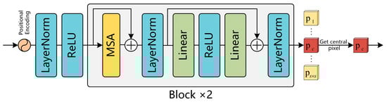 Inspired by the “class token” in the VIT (vision transformer) [], a Spatial Feature Extraction Module was designed for extracting spatial information from remote sensing images for image classification, as demonstrated by Figure 4. The architecture of this module is very similar to that of the Temporal Feature Extraction Module, including the positional encoding and feature extraction block. The positional encoding was adopted here to learn the positional relationship between the central pixel and other pixels within an image patch. At the end of the module, features located at the central pixel of each patch were extracted especially, and they were taken as the “class token” in the Spatial Feature Extraction Module. By doing so, the most useful spatial information within an image patch can be aggregated and assigned to the “class token”.