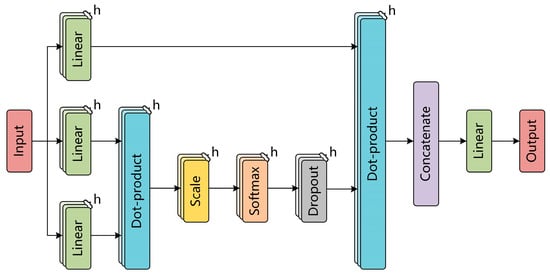 The MSA layer was adopted in all three modules to learn more important features from remotely sensed images. The structure of the MSA layer is demonstrated in Figure 5, with its major steps elaborated in detail, as follows. First, the input vector was split averagely into sections (attention heads), which were replicated into three copies. Each attention head of each copy was subsequently fed into a linear layer for linear transformation. Second, a dot product operation was performed between the heads in the first copy and the corresponding ones in the second copy. Each value of the calculated matrices was scaled into normalized value, based on which a softmax function was adopted to transform the matrices to weight matrices. A dropout layer was subsequently employed after the softmax function to avoid the over-fitting issue. Third, a dot product operation was implemented again between the derived weight matrices and the corresponding attention heads from the third copy. By doing so, new attention heads were acquired and then concatenated into a single feature, which was subsequently processed through a linear layer. The final features were, therefore, acquired and outputted from the MSA layer. The calculation process of MSA layer can be expressed using the following three formulas: