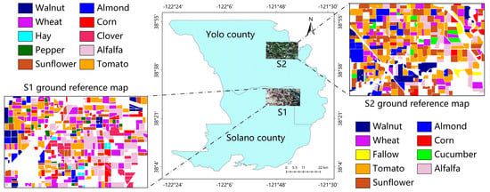 The Sacramento Valley within the Central Valley of California, USA, was chosen as the study area in this research (see Figure 6). The climate of this region is characterized as Mediterranean, with hot summers and wet winters. The average temperature is approximately 16.5 °C, and the annual rainfall is about 437 mm. This region is relatively flat and has fertile soil. The Sacramento River provides abundant water resources, creating favorable growing conditions for diverse crop categories. In this research, we chose two representative sites within this valley, namely S1 and S2. Both sites possess rich and diverse crop classes, making them ideal for testing the capability and generalizability of the proposed method.