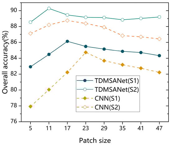 Both TDMSANet and CNN are image patch-based deep learning models, and the image patch size, therefore, markedly affects the performance of the two models []. A sensitivity analysis of image patch size on model accuracy was performed. Figure 7 illustrates the variations in overall accuracy achieved by TDMSANet and CNN over the two study sites with the image patch size varying from 5 × 5 to 47 × 47 with a step size of 6. As can be seen from the figure, TDMSANet outperformed CNN prominently across various image patch sizes in both S1 and S2, demonstrating its great capability for crop mapping using image time series. Specifically, the proposed TDMSANet and the CNN exhibited similar trends in OA over both S1 and S2. The OA for both methods boosted significantly when adopting gradually larger image patch sizes, and it started to decrease after reaching the maximum OA with the increase in patch size. The TDMSANet and CNN achieved the highest OAs with patch sizes of 17 × 17 and 23 × 23 in S1, and patch sizes of 11 × 11 and 17 × 17 in S2, respectively. However, the OA of CNN across both study sites decreased rapidly when the patch size exceeded 23 × 23 in S1 and 17 × 17 in S2, which were the patch sizes associated with the highest OAs. In contrast, the OA of TDMSANet decreased relatively slowly when the patch size exceeded 17 × 17 in S1 and 11 × 11 in S2, demonstrating its robustness and insensitivity to variations in image patch sizes.