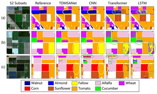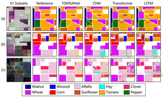 The superiority of TDMSANet can also be observed from the per-class classification accuracy detailed in Table 4. The table illustrates that TDMSANet achieved the highest mapping accuracy across the majority of crop categories in S1 and in four categories in S2, as highlighted by the bold numbers. For S1, the most pronounced increase in accuracy was observed for Clover, which exhibited a remarkable accuracy of 92.98%. This was higher than the CNN, Transformer and LSTM by 17.54%, 9.65% and 19.30%, respectively. Similarly, a marked accuracy (3.45–15.52%) increase was also seen for both Almond and Pepper in comparison to the benchmarks. For S2, the TDMSANet generally achieved significantly higher per-class mapping accuracy compared to the Transformer, LSTM, and CNN. For example, the mapping accuracy for Walnut was 93.94%, higher by 7.58% and 16.16% compared with that of Transformer and LSTM, respectively. The accuracy increases for Fallow were also notable, registering an increase of 11.66% and 23.33% in comparison to Transformer and LSTM, respectively. Similarly, the TDMSANet increased mapping accuracy for most of the crop categories in comparison to CNN. Specifically, the accuracy increase was over 12% for Fallow and Cucumber, and over 2% for Walnut and Tomato.