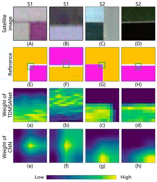 Typical image subsets from the two sites and their corresponding weight maps achieved by CNN and the proposed TDMSANet. (A–D) typical image subsets from the two sites, (E–H) the corresponding reference maps (target and non-target fields are highlighted in pink and yellow colors, respectively), (a–d) the corresponding weight maps within an image patch (green rectangles in the Reference maps) by TDMSANet, (e–h) the corresponding weight maps within an image patch (green rectangles in the Reference maps) by CNN. Note that each blue dot in subfigures (E–H) indicates the center pixel of a convolution patch.