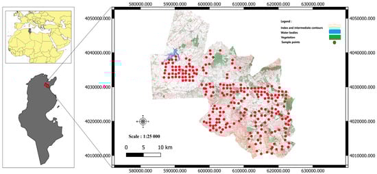 This study was conducted in Zaghouan Governorate, in northeastern Tunisia. It covers approximately 94,250 ha, as shown in Figure 2. The region is characterized by a semi-arid Mediterranean climate characterized by mild, rainy winters and hot, dry summers.