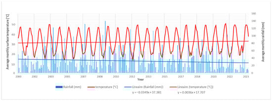 Average monthly precipitation and temperature recorded between 2000 and 2023 with linear trend lines for temperature (in red) and rainfall (in blue). (Source: Regional Commissary for Agriculture Development of Zaghouan, 2023).