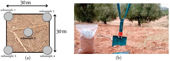 A total of 229 georeferenced soil samples representing the various soil types in the study region were gathered during the field survey, which took place between 20 September and 7 October 2021. The sampling design ensured comprehensive spatial coverage across the study area to capture variations in LULC and associated changes. Each sampling site consisted of a composite sample formed by combining five subsamples: one collected from the center and four from the corners of a 30 m × 30 m plot []. Corner subsamples were taken approximately 21 m from the center. This approach was employed to account for the spatial heterogeneity of soils (See Figure 4).
