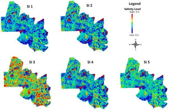 In this study, five different SIs were derived from Landsat 8 imagery for the year 2021 using specific band combinations, as presented in Table 4. These indices were calculated based on spectral reflectance values extracted from single-date Landsat 8 satellite imagery coinciding with the field campaign period. This timing was critical, as it ensured alignment with ground-based soil electrical conductivity (EC) measurements, which served as the reference for validating the salinity model.