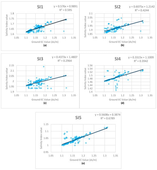 The derived indices were evaluated using linear regression analysis to determine their correlation with field-measured soil salinity levels.