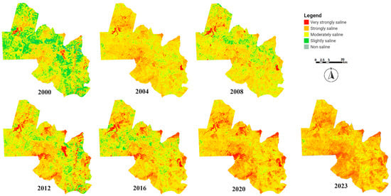 Finally, the findings of this study have to be seen in light of some limitations. First, the 24-year temporal focus (2000–2023) may not fully capture short-term fluctuations in soil salinity and LULC changes, particularly seasonal variations and extreme weather events that can significantly affect salinity levels. In addition, the use of Landsat imagery, with its moderate spatial resolution, may limit the detection of finer-scale changes in LULC and soil salinity. Lastly, while machine learning algorithms were employed for LULC classification, their accuracy can be impacted by factors such as cloud cover and seasonal vegetation changes, potentially leading to misclassifications and inaccurate assumptions about the relationship between LULC and soil salinity.
