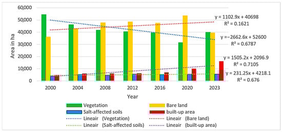 Moreover, the expansion of agricultural activities into marginal lands, driven by the need to meet the growing global demand for food, has led to significant land use and land cover changes, further exacerbating soil salinization. Thus, other recent studies have highlighted the importance of integrating remote sensing data with LULC information to better understand the drivers of soil salinization. The transformation of LULC, often induced by urbanization, deforestation, agricultural expansion, and industrialization, has become a prominent environmental concern []. Monitoring and understanding these changes are essential for assessing their impacts on various ecological processes, including soil salinity levels. The incessant alteration of LULC can significantly influence the hydrological and biogeochemical cycles, leading to changes in soil properties and salinity levels []. Soil salinity, characterized by high concentrations of soluble salts, has profound implications for agriculture, water resources, and overall ecosystem health. As land use shifts occur, there is an increased risk of soil salinization, posing threats to agricultural productivity and environmental sustainability [].