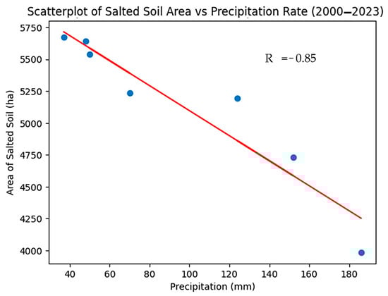 Scatterplot between areas affected by soil salinity and precipitation over the study area between 2000 and 2023 (p ˂ 0.05).