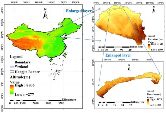 The Kubuqi Desert is the seventh largest desert in China, spanning the Hangjin Banner, Dalate Banner, and Zhungeer Banner of the Erdos, and is adjacent to the Yellow River on three sides in the east, west, and north. The terrain is high to the south and low to the north. The total desert area is approximately 18,600 km2 and is located in the transition zone between arid and semi-arid climates []. Hangjin Banner has the largest area, accounting for approximately 50% of the county’s total area. The research area is located in the Hangjin Banner section of the Kubuqi Desert, and its spatial scope was determined by field investigation and project planning (Figure 1).