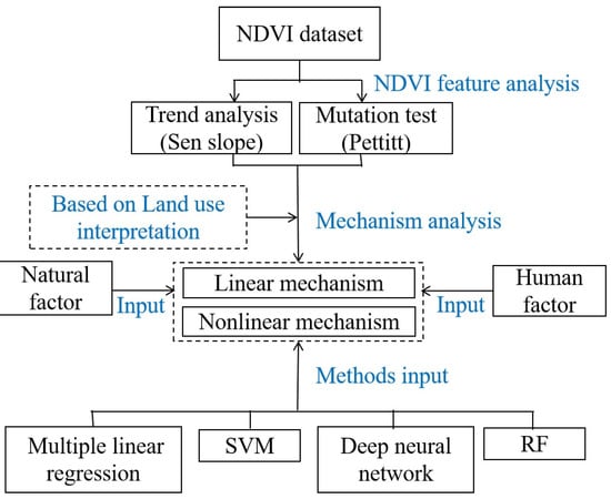 In this paper, Sen slope estimation and the pettitt mutation test are used to analyze the change characteristics of NDVI. When analyzing the driving mechanism of NDVI, a variety of factors are considered. Not only is the conventional multiple linear regression adopted, but also a variety of nonlinear methods are introduced, including random forest (RF), support vector machine (SVM), and deep neural network, which have the advantage of being more suitable for the actual situation of vegetation. In addition, the SVM supervised classification method was used to invert land use types, and overall accuracy (OA) and the kappa coefficient were combined to evaluate classification accuracy.