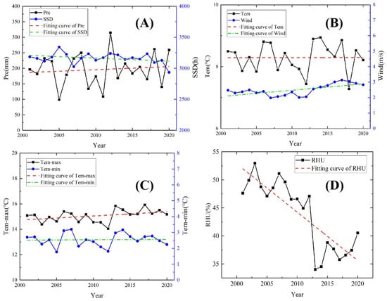 Interannual variation trend of meteorological elements in the ecological management area from 2001 to 2020. ((A) indicates the variation trend of Pre and SSD; (B) indicates the variation trend of Tem and Wind; (C) indicates the variation trend of Tem-max and Tem-min; (D) indicates the variation trend of RHU).