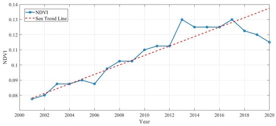 In this study, the Sen slope estimation method was used to analyze the MODIS NDVI trend in the ecological management area of the Kubuqi Desert from 2001 to 2020. The results are shown in Figure 3.