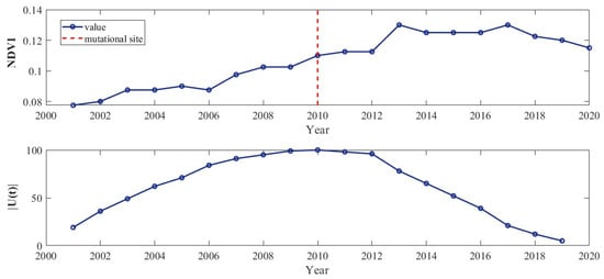 The interannual variation characteristics of the NDVI in the study area showed fluctuating changes in the series. To further reveal the change rule of the NDVI, this study adopted the Pettitt method to conduct mutation tests. The results are shown in Figure 4.