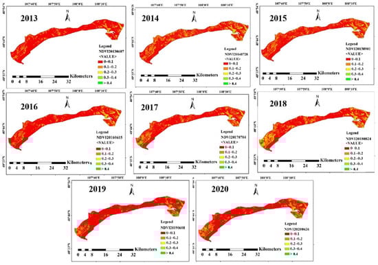 This study used Landsat8 data with a spatial resolution of 30 m from the United States Geological Survey (https://earthexplorer.usgs.gov/, URL (accessed on 17 September 2023)), widely employed in the spatial distribution of NDVI and land use analysis []. Since the Landsat8 data source commenced in 2013, this study selected data from 2013 to 2020 for NDVI spatial feature analysis. In addition, satellite images of the annual growing season (June–September) before the water diversion (2013), the minimum water diversion year (2014), and the maximum water diversion year (2019) were selected to analyze land use change.