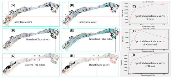 Image display and spectral attribute ((A–C) represent true and false color composition and the spectral attribute of the lake in 2013, respectively; (D–F) are for Grassland in 2014, and (G–I) are for desert in 2019).