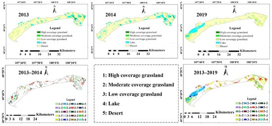 The results showed that the change in sandy land was not significant during the initial stage of water diversion in 2014. In the southwestern part of the study area, a small area of sandy land was transformed into lakes and grasslands, the central part was mainly sandy land, and the northeastern part was scattered with grasslands and lakes. In 2019, a large area in the southwest of the study area was transformed into a lake; the grassland area was significantly expanded and mainly distributed around the lake. The central area was sandy. The northeast was scattered with small grasslands and lake areas.