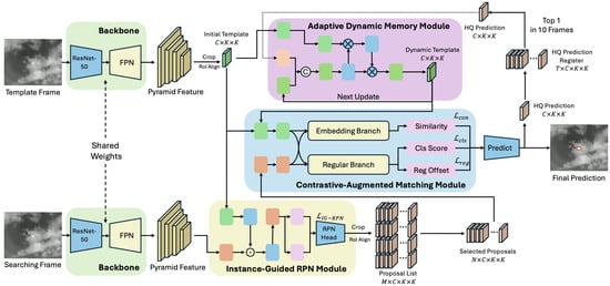 The main architecture of CAMTracker. The whole tracker mainly contains four parts, including a pair of backbones, an instance-guide region proposal network (IG-RPN), a contrastive-augmented matching module (CAM) and an adaptive dynamic memory module (ADM).