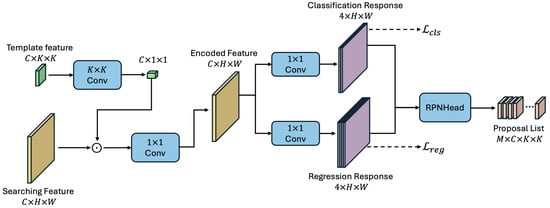 where and denote convolution operation with the kernel size of and , respectively. ⊗ indicates the correlation calculation. In the correlation encoder, is first convoluted by a filter and converted to an integrated target feature with the size of . After that, correlation between and the integrated target feature is conducted, which outputs a correlation map. The correlation map is then refined by a convolution layer and delivered to the RPN. Classification scores and regression results will be presented by the RPN; thereby, the proposal list is formed by the regression bounding boxes with the highest scores.