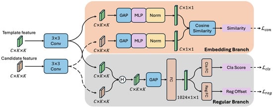 In order to tackle this challenge, a contrastive-augmented matching module is proposed, with the acronym CAM, which incorporates contrastive learning strategies into the anti-UAV tracker to enhance the ability to distinguish targets from distractors. The structure of CAM is illustrated in Figure 3, mainly consisting of a regular branch and an embedding branch. In Figure 3, Ⓗ means the Hadamard production. Among the branches, the regular branch performs classification and regression in most GIS methods. Meanwhile, the unique embedding branch is responsible for mapping templates and proposals into an embedding space and calculating the similarity scores between the templates and candidates. The similarity scores are used to assist the classification prediction during the inference process.