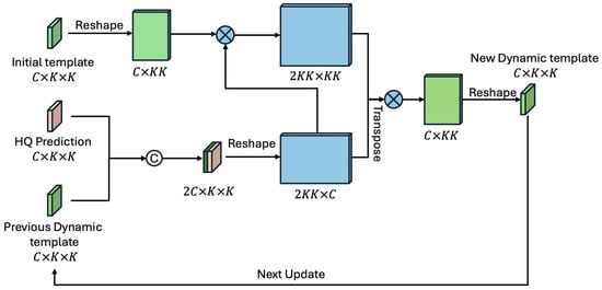 The adaptive dynamic template updating strategy is presented as Figure 4 shows, where Ⓒ indicates concatenation and ⊗ means matrix multiplication. Especially, the initial template is regarded as the dynamic template at the beginning of online tracking. At the t-th frame of the sequence, the network first distinguishes whether the predicted result is a high-quality prediction according to the classification score threshold . If is a high-quality prediction, the target feature is obtained through RoIAlign, corresponding to the bounding box predicted in . After that, an integrated feature is obtained by concatenating and , where indicates the dynamic template at the t-th frame. now contains information of historical predictions and the latest high-quality result. Subsequently, is reshaped to the size of and is reshaped to the size of . Then reshaped and reshaped are multiplied to get the pixel-to-pixel similarity matrix , which is operated by a softmax function on a single dimension for normalization. The process can be denoted as