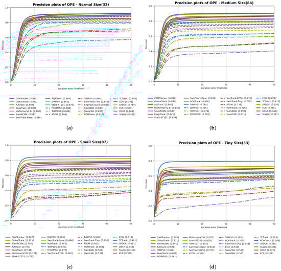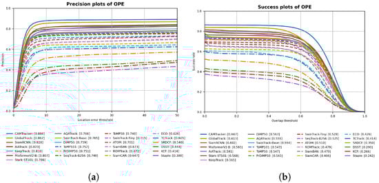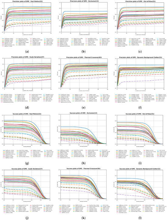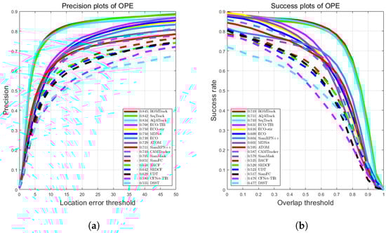 where N is the number of all sequence frames. means the center distance between the ground truth and the predicted target, while denotes the threshold. is an indicator function which returns 1 when the input is true, otherwise, it returns 0. In the experiments, the threshold is conventionally set to 20 pixels.