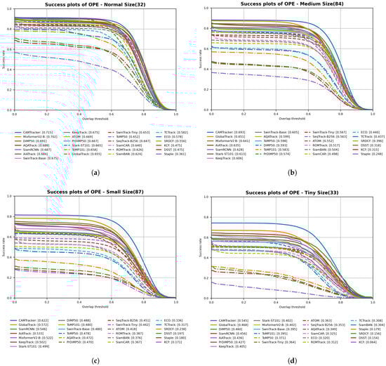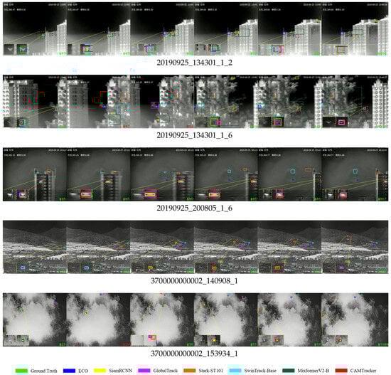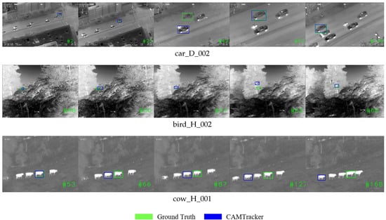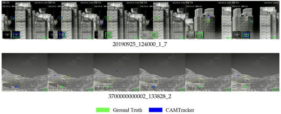 For model training, CAMTracker is optimized by stochastic gradient descent (SGD). The momentum and weight decay are set to 0.9 and 1 × 10−4. During training, each image pair is generated from the same sequence. The maximum distance between two frames in an image pair is set as 300. The model is trained on Anti-UAV410 for 12 epochs, with an initial learning rate of 0.01. The learning rate descends by 0.1 at the beginning of the eighth and 11th epoch. The weights in Equations (11) and (22) are set as , and . The temperature factor in CAM is set to 0.1.