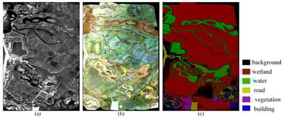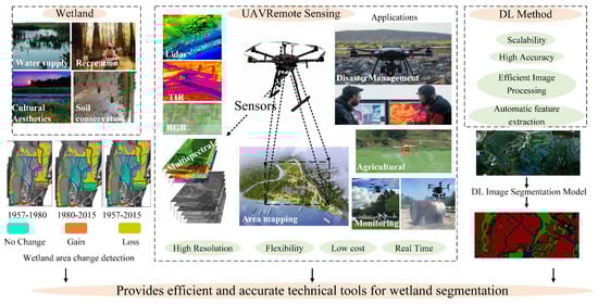 Effective conservation and management of wetlands require precise delineation and continuous monitoring of these areas [5,6]. Mapping wetlands and understanding their ecological attributes are crucial components of this process. Unmanned aerial vehicle (UAV) remote sensing technology has emerged as a powerful tool in this context, offering numerous advantages over satellite-based remote sensing. By tracking changes in wetlands over time, stakeholders such as conservationists and policymakers can make informed decisions and implement appropriate strategies for the protection and rehabilitation of wetland ecosystems [5,7]. As illustrated in Figure 1, UAVs provide high-resolution imagery, enabling the capture of detailed information about wetland surfaces. This high resolution is particularly important for accurately delineating wetland boundaries and identifying specific features such as vegetation types and water bodies. In addition to high resolution, UAVs offer flexibility in terms of deployment [8,9,10,11,12,13,14]. They can be flown at specific locations and times, providing targeted data collection for different wetland areas. This flexibility allows for customized monitoring approaches that can adapt to the unique characteristics of each wetland ecosystem. Cost-effectiveness is another advantage of UAVs. Compared to traditional methods such as ground surveys or manned aircraft, UAVs are more affordable to operate. They require lower operating costs and can be easily controlled by trained operators, reducing the need for extensive resources and personnel. Furthermore, UAVs can capture rich and detailed wetland surface information by carrying different sensors including RGB (red, green, and blue), multispectral (MS), and thermal infrared (TIR) sensors [15,16,17,18,19]. RGB sensors function similarly to the human eye. They capture visual information in these three primary colors, creating a comprehensive and vibrant image of the landscape. For example, they can reveal the rich diversity of a wetland’s flora and fauna or provide a clear view of the water’s surface. MS sensors are designed to capture data in specific spectral bands, which can be especially useful in analyzing vegetation health and stress. For instance, they can detect subtle changes in the color or reflectance of plant leaves, which may indicate disease or nutrient deficiency. In a wetland context, they might be used to monitor the health of aquatic plants or to identify areas of invasive species. TIR sensors measure thermal radiation, which can be used to assess water temperature and energy exchange processes in wetlands. These measurements can provide crucial insights into the wetland’s health and function. For example, changes in water temperature can affect the life cycles of many aquatic species, while understanding energy exchange processes can help scientists predict how the wetland might respond to environmental changes such as global warming.