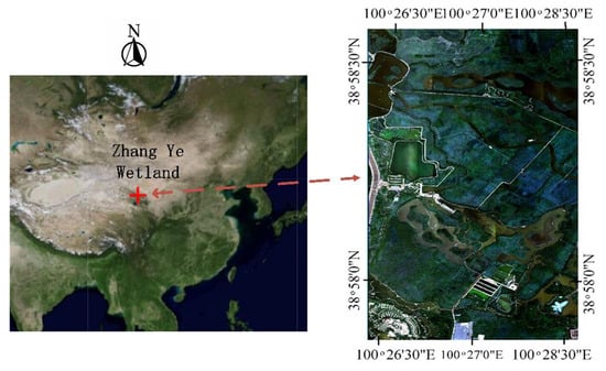 The study area is situated in the northern suburb of Zhang Ye Wetland Park, Gansu Province, Northwest China, as depicted in Figure 2. This region, which is part of the Zhang Ye Wetland Park, covers a total area of approximately 1347.65 hectares. The park is known for its rich biodiversity and diverse ecosystems, including wetlands, grasslands, and various water bodies. The research focus is on the area’s ecological characteristics and land use patterns. As depicted in Figure 3, the experiment employed a UAV, specifically the DJI M600 Pro (SZ DJI Technology Co., Ltd., Shenzhen, China), equipped with both an MS camera (Red Edge-M) (MicaSense Inc., Seattle, WA, USA) and a TIR camera (WIRIS Pro Sc) (Workswell Corp., Prague, Czech Republic). The Red Edge-M camera features five bands—red, green, blue, NIR, and REG—with a spectral response range of 0.4–0.9 µm. The WIRIS Pro Sc camera operates within the spectral range of 7.5–13.5 µm and has a single band. During the flights, the UAV maintained an altitude of approximately 300 m above ground level, resulting in a ground resolution of 0.4 m. The dimensions of the MS and TIR images for the entire area are 5947 × 12,192 and 3390 × 6203, respectively [46,47].