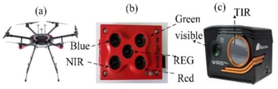 (a) UAV M600 Pro; (b) MS camera (Red Edge-M); (c) TIR camera WIRIS.