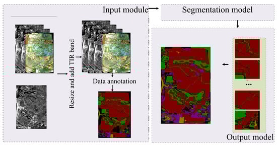 The input module of the Segmentation model is designed to accommodate both single-channel and multichannel inputs. This module primarily focuses on preprocessing the input data. Initially, the MS and TIR images are resized to a uniform dimension. Subsequently, a six-band MS image is generated through the concatenation of the TIR band with the other spectral bands. For model training, a UAV dataset was constructed through data annotation and slicing. As illustrated in Figure 5, five distinct objects within the study area were annotated. The UAV images utilized in this research are registered images sourced from a previous study [46,47]. The following is the flow chart of data processing: