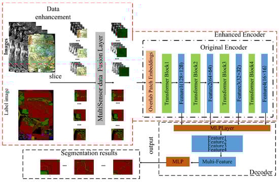As shown in Figure 6, our segmentation model Segformer * is a fine-tuned version of the original Segformer model. It consists of two main components: an encoder and a decoder. The encoder plays a crucial role in extracting feature information from the input image. Based on the original Segformer encoder structure, we have made enhancements to better handle multisensor data in our Segformer * model. Specifically, we have added a convolutional layer to the input stage of the encoder, allowing us to fuse the multisensor data information through convolution. This approach enhances the locality of the extracted features and effectively preserves the spatial structure information. Our experiments have led us to choose the MixB2 encoder structure in the original Segformer. On the other hand, we have maintained the original lightweight All-MLP decoder in our model. The decoder is responsible for fusing the multi-level features extracted by the encoder with the predictive semantic segmentation mask. This fusion process enables the model to generate accurate and detailed segmentation results.