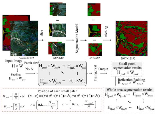 The output module is responsible for image post-processing, as the original image is divided into smaller chunks during the training process to alleviate the computational burden on the model. Initially, the model predicts the category labels for each sub-chunk, and subsequently, these predictions are stitched together to form the final prediction for the entire image. The primary objective of the data post-processing phase is to aggregate the segmentation results of all small image segments to obtain the comprehensive segmentation of the entire area. This is achieved by directly stitching the small patches based on their pixel indices. The details of this process are illustrated in Figure 7.