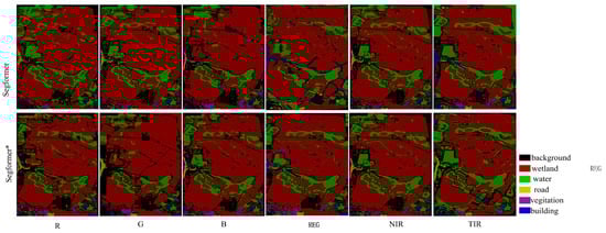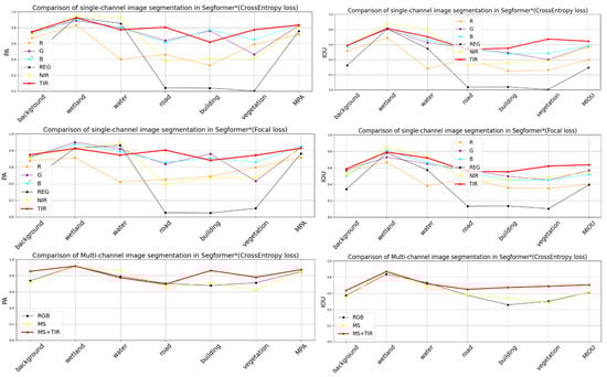 In this experiment, we conducted a comparative analysis of multichannel images to elucidate the role of thermal infrared (TIR) image features in multichannel segmentation tasks. The channels examined included RGB (three channels), MS (five channels), and MS+TIR (six channels). Specifically, we compared the performance of our strategy with that of the original Segformer in multichannel image segmentation. Our primary focus was to analyze the impact of TIR image features on segmentation outcomes and to compare the performance differences between models trained on RGB images and those trained on multichannel images.