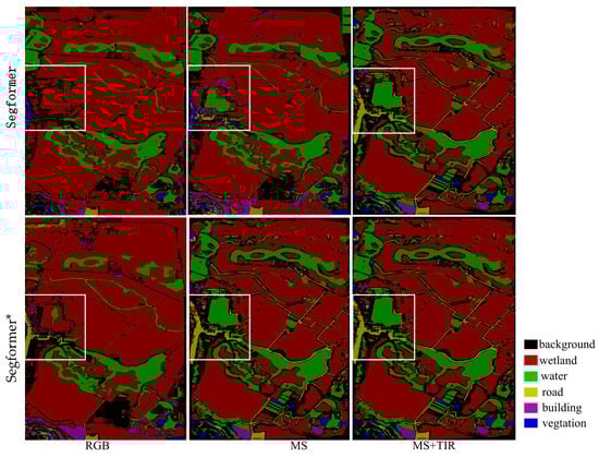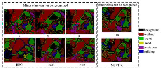 In addition, combining the experimental results of Figure 12 and Figure 13, it is evident that the inclusion of thermal infrared image features significantly enhanced the segmentation performance across all classes. For the minority classes such as roads, buildings, and vegetation, the accuracy and IoU scores showed an increase when thermal infrared data were incorporated. This indicates that thermal information helped to distinguish between classes that may appear similar in visible light, thus aiding in the identification of minority classes, and which have a relatively stable trend in accuracy across all categories. In the case of wetland and water classes, which are the majority classes in our dataset, the addition of thermal infrared features also led to a slight improvement in segmentation performance. This indicates that thermal data can complement visible imagery even for well-represented classes.