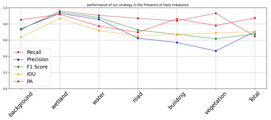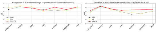 As illustrated in Figure 12, we can elaborate on the impact of different loss functions on the segmentation outcomes. Specifically, the Sigmoid Focal Loss function was applied to address the data imbalance issue, particularly for the minority classes such as roads, buildings, and vegetation. The adoption of the Focal Loss function proved to be particularly effective in boosting the segmentation precision for the minority classes. This loss function is designed to focus on hard-to-classify examples and reduce the relative loss for well-classified examples, thereby providing a greater emphasis on the minority classes during the training process. As a result, the PA and IOU scores for roads, buildings, and vegetation showed a noticeable improvement when compared to the segmentation performance achieved with the standard Cross-Entropy loss. However, despite the Focal Loss’s efficacy in enhancing the segmentation accuracy for the minority classes, the overall segmentation performance, when evaluated across all categories, was found to be slightly inferior to the strategy that employed the Cross-Entropy loss in conjunction with thermal infrared data. This strategy demonstrated a more consistent improvement in segmentation metrics across the board, indicating that while the Focal Loss does address the issue of class imbalance, the complementary information provided by thermal infrared data may have a broader and more uniform positive impact on the segmentation results.