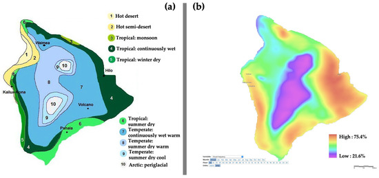 Island of Hawai’i: (a) Köppen climate map adapted from Mauna Loa Observatory Report [40] and (b) the annual mean cloud cover percentage based on the Hawai’i Climate Atlas [39].