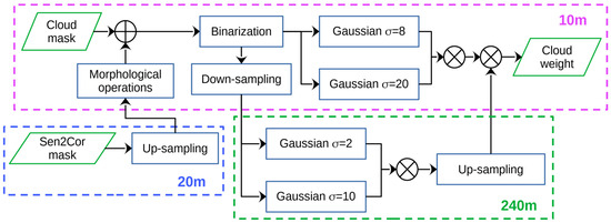 Cloud weight computation for a single Sentinel-2 image, showing different spatial resolutions used during the process.