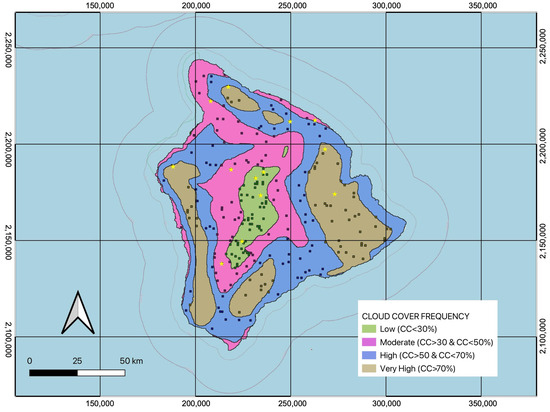 Cloud cover stratification across the island of Hawai’i, derived from data provided by the Hawaiian Climate Atlas [39]. The black squares represent the locations of the evaluated blocks (a total of 240 blocks, each covering 100 hectares) within each cloud cover stratum (60 blocks allocated to each cloud cover stratum). Yellow stars indicate the spatial distribution of the sample blocks presented in Results.